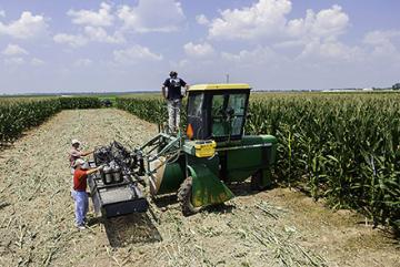 In Stoneville, Mississippi, plant pathologist Hamed Abbas (red shirt) and his field crew prepare to spray corn with a new aflatoxin-control formulation. (Stephen Ausmus, D1899-1)