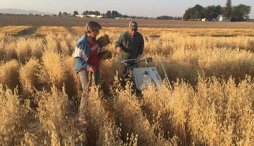 ARS research geneticist Kathy Esvelt Klos and Texas A&M research scientist Russell Sutton harvest oat rows. (Photo courtesy of Kathy Esvelt Klos)
