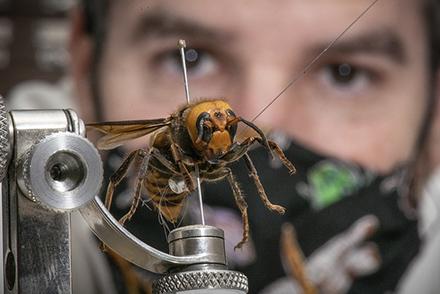 An ARS scientist inspects a specimen of the Vespa mandarinia, the infamous Asian giant hornet (AGH). The AGH is one of the species being sequenced as part of the Ag100Pest initiative. (Photo by Lance Cheung, USDA)