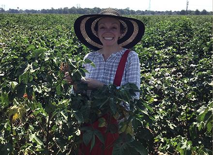 Molecular biologist Michelle Heck scouts for aphids in a cotton field. (Photo by Jennifer Wilson, Cornell University)
