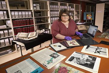 At the National Agricultural Library, in the 5th floor special collections, Wikipedian-in-Residence Jamie Flood updates information in Wikipedia about the special collections of Dr. Hazel Stiebling and watercolorist Deborah Passmore. (Stephen Ausmus, D4207-1)