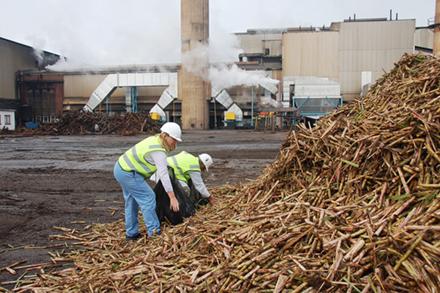 Researchers collect samples of sugarcane prior to processing to see if it is infected with bacteria. (Photo courtesy of Isabel Lima)