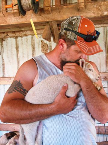 At an Armed to Farm Boot Camp in Fayetteville, Arkansas, a veteran cares for a lamb as part of a weeklong training in the Military Veteran Small Farm Program. (Hannah Rivera, D4075-1)
