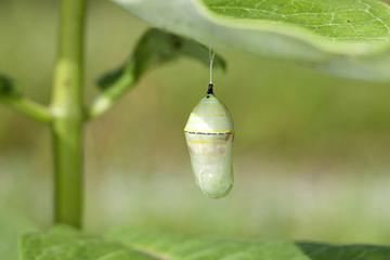 A monarch chrysalis hangs from the leaf of common milkweed, Asclepias syriaca. This is the stage in the life cycle where the caterpillar changes to a butterfly. According to an ARS and Iowa State University study of nine milkweed species native to Iowa, female monarch butterflies laid eggs in all nine milkweeds, but the swamp and common milkweed averaged the highest number of eggs. (Peggy Greb, D4226-1)