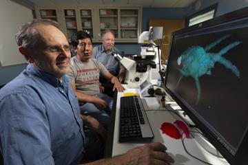 At the ARS Electron and Confocal Microscopy Unit in Beltsville, MD (left to right), Ron Ochoa, an ARS entomologist and mite expert; Javier H. Maldonado, a visiting entomologist from Peru; and Gary Bauchan, lab director, use a laser scanning confocal microscope to identify plant-feeding mites found on a recent trip to the highlands of Peru. (Stephen Ausmus, D4245-1)